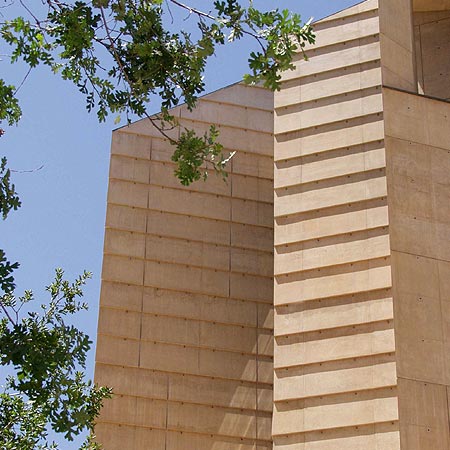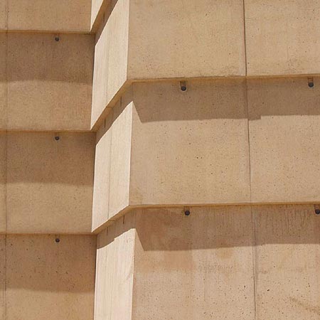 把表面構(gòu)造成更小的元素的外觀來(lái)改造大教堂的大平面元素,這些元素不僅增加了外部特征,并且隱藏在現(xiàn)澆混凝土不可避免的表面顏色的微小變化。教堂選用金色砂石和阿爾博?白水泥混合而成的金色色調(diào)。