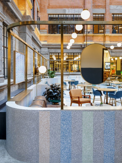 這幢位于市中心的始建于上世紀(jì)的老式磚房當(dāng)時(shí)是一座鴉片廠,之后成了一名藝術(shù)家的住所,這次再次的翻新是做了細(xì)致的考慮的,全部的設(shè)計(jì)元素都是設(shè)計(jì)師為了表達(dá)一種看似漫不經(jīng)心,卻又能為在其中辦公的人們提供最周到服務(wù)的現(xiàn)代化辦公空間而精心安排的。大廳采用阿爾博?白水泥混合多種顏料形成簡(jiǎn)潔明快的現(xiàn)澆水磨石地面。阿爾博?白水泥作為極具表現(xiàn)力的原材料產(chǎn)品,賦予建筑師和設(shè)計(jì)師無(wú)限的靈感。